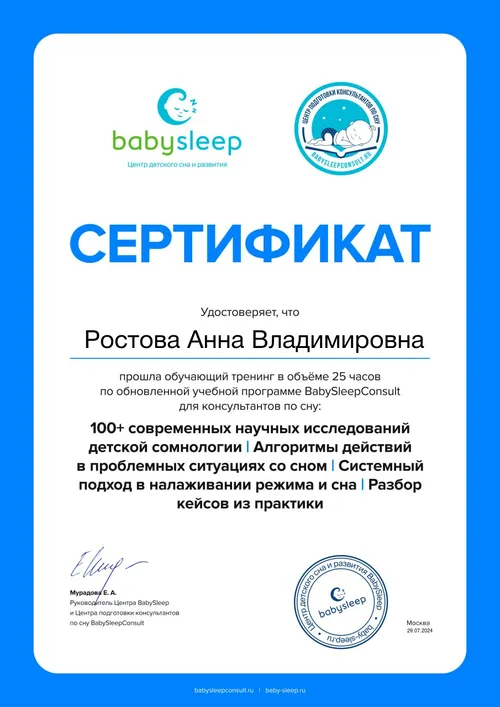 Анна Ростова потрясающий консультант! Очень внимательный! Видно было, как Анна пытается всеми силами нашей семье помочь! И как искренне радовалась нашим успехам! Мы все время пытались уйти от укачиваний и нам казалось, что ребёнку это надо, но на деле оказалось, что ребёнок хочет сам засыпать! И Анна практически сразу это поняла по нашим рассказам! Это просто гениально! Анна огромный специалист! На расстоянии и не пообщавшись с нашим ребёнком она смогла нам помочь! Спасибо большое!