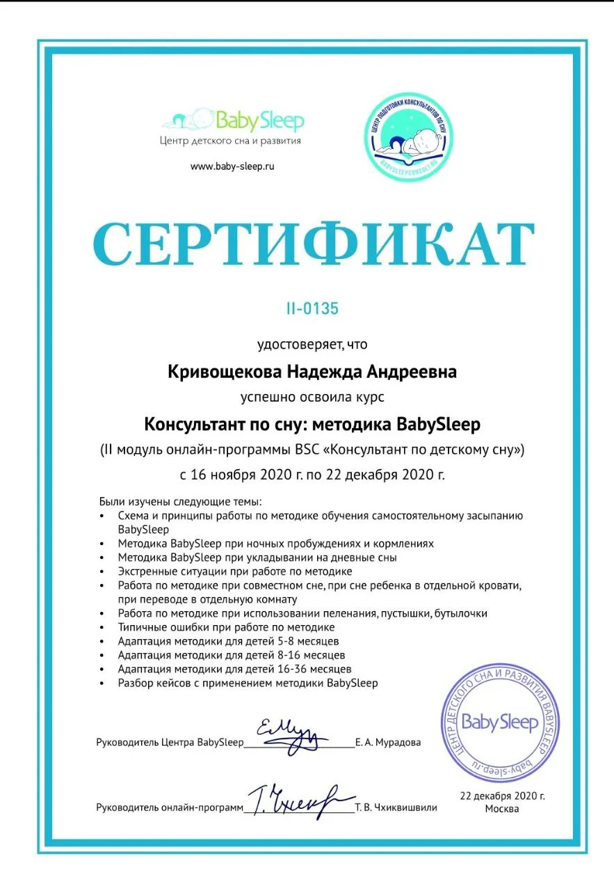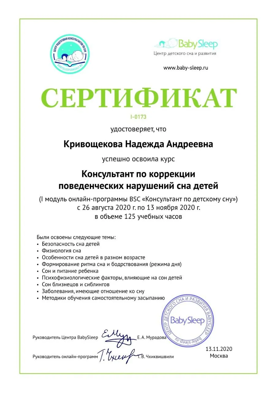 Надежда Кривощекова — отличный профессионал и потрясающий человек! Было очень комфортно работать с ней. Объясняла мне все доступным языком. Самое главное, что наша цель по налаживанию сна была достигнута. Сейчас проблем со сном не имеем. Я очень благодарна за это!