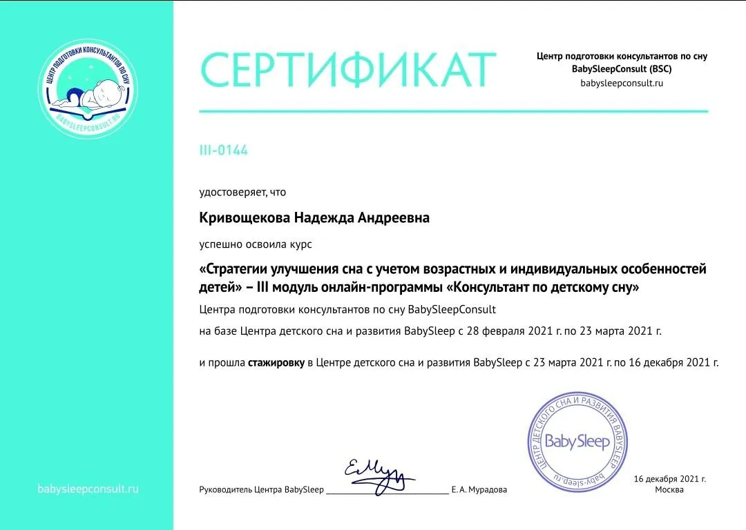 Надежда Кривощекова доступно, подробно подсказала мне дальнейшие действия для отлучения сына от укачиваний. Не впервые пользуюсь услугами консультантов BabySleep, целей достигаю с их помощью всегда. Спасибо.