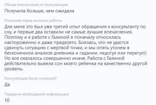 На первой встрече с Галиной я честно призналась, что нахожусь на стадии выгорания и отношусь с опаской к консультантам. Но все-таки хочу попробовать еще раз, потому что истерики малыша меня сильно тревожат и изматывают. Я взяла полное сопровождение и не пожалела ни секунды. Работа с Галиной в корне отличалась от опыта с другими консультантами. Мы работали плавно, системно и последовательно.